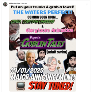 On July 21st 2025, William Gloryhole made a community post[2] on his YouTube channel proclaiming that he and Lord of the Groove were working with the TV channel Adult Swim to produce an fully-fleshed animated series revolving around the Goblin of Akron.