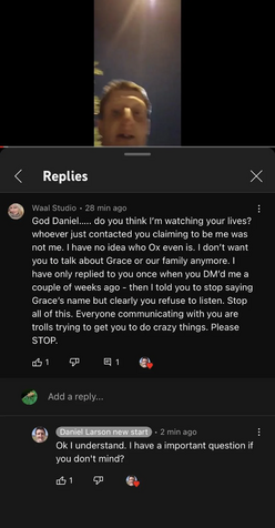 <blockquote><big>'''God Daniel….. do you think I’m watching your lives? whoever just contacted you claiming to be me was not me. I have no idea who Ox even is. I don’t want you to talk about Grace or our family anymore. I have only replied to you once when you DM’d me a couple of weeks ago - then I told you to stop saying Grace’s name but clearly you refuse to listen. Stop all of this. Everyone communicating with you are trolls trying to get you to do crazy things. Please STOP. -Tina VanderWaal'''</big> </blockquote> | <blockquote><big>'''God Daniel….. do you think I’m watching your lives? whoever just contacted you claiming to be me was not me. I have no idea who Ox even is. I don’t want you to talk about Grace or our family anymore. I have only replied to you once when you DM’d me a couple of weeks ago - then I told you to stop saying Grace’s name but clearly you refuse to listen. Stop all of this. Everyone communicating with you are trolls trying to get you to do crazy things. Please STOP. -Tina VanderWaal'''</big> </blockquote> | ||
