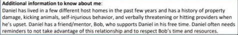 At about age 11, Daniel was taken away from his mother by the State of Colorado due to neglect, which Daniel and a later news report reaffirm.[11][12] Given the state's actions, it is likely that Daniel was being truthful regarding his later claims of neglect. Daniel claims that he bounced between 10 to 15 foster homes in the years following the state's intervention. This is evidenced by leaked documents that the Developmental Disabilities Resource Center (DDRC) sent to potential fosters families/host homes. These documents warns families that Daniel, "...has a history of property damage, kicking animals, self-injurious behavior, and verbally threatening or hitting providers when he's upset," which corroborates claims of him being extremely violent, even in childhood.